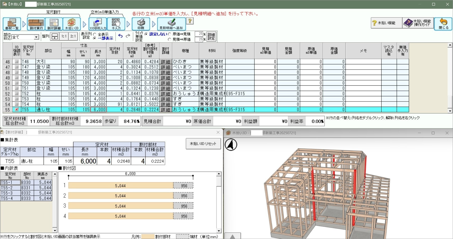 また、個人的に最大の決め手となったのは「構造EX」と「あっと簡単見積」の連携による「木拾い機能」です。以前は、坪単価などの「面積按分」で見積を作成していましたが、勾配天井や登り梁が増えたりするとあっという間にコストが上がり、実際のコストとズレが生じてしまう。そのことに悶々としていたので、ホームズ君に「木拾い機能」を見つけたときは、「これだ!」と思いました。