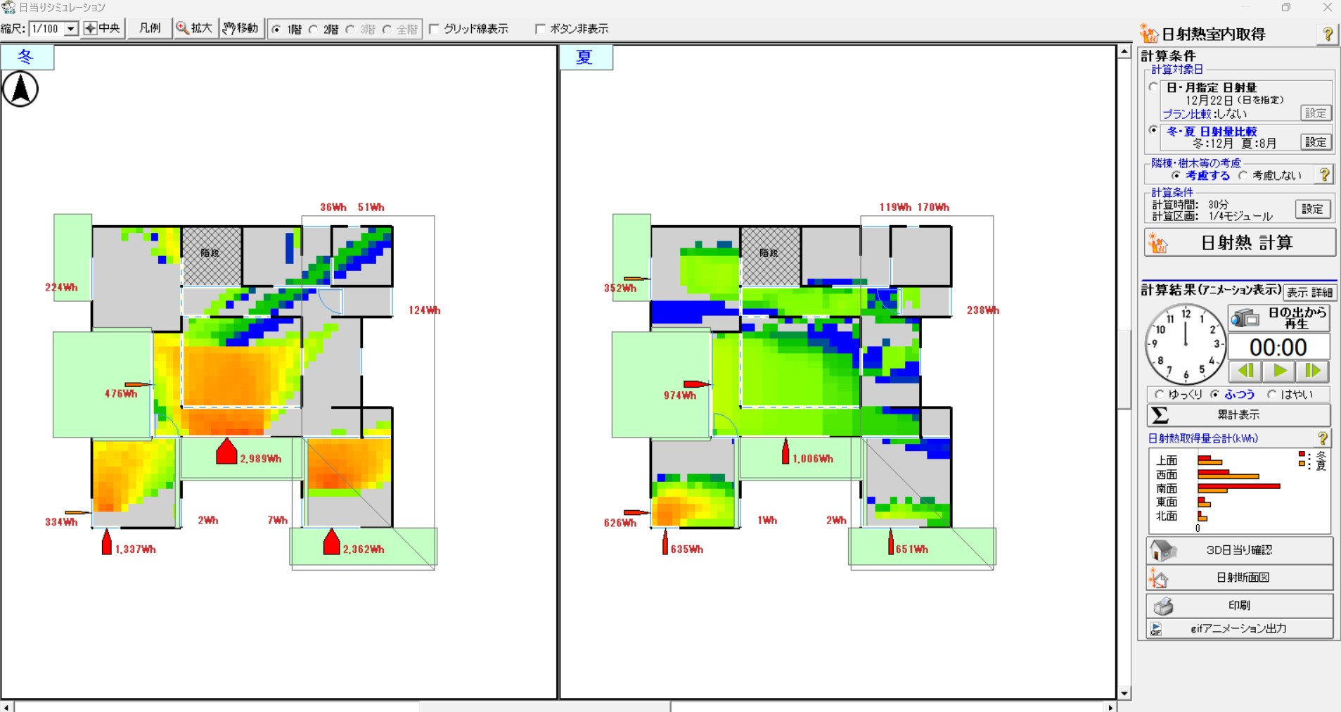 また、単に数値を出すだけでなく、窓からの日射熱取得データを活用して、室温がどう変化するかをシミュレーションできる点も助かっています。例えば、眺望を優先して西側に窓を多く設ける場合でも、「これだけの日射熱が入るので、室温はこれくらいになります」と根拠を持って説明できるため、納得感のある提案ができています。