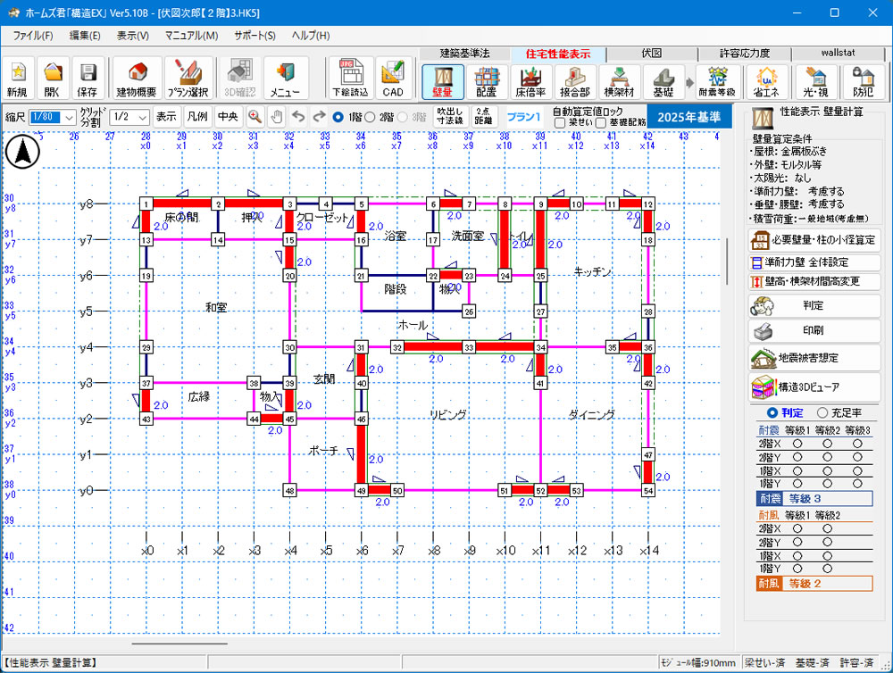 耐力壁を追加すると、存在壁量がどれだけ増えるかリアルタイムでわかる(構造EX)